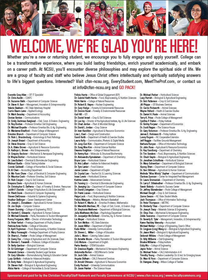 Our “Fall Ad” for incoming freshmen and returning students runs in the Technician prior to the end of the Fall semester, and it is also linked to 45,000 emails to students, faculty, and staff at NC State. The ad is endorsed by more than 160 faculty and staff who point to Jesus Christ. Click here to see a sample.